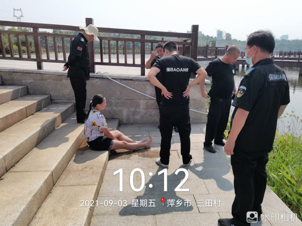 9月3日上午10點左右,領威保安駐萍水湖濕地公園項目保安員陳海軍在萍水湖濕地公園北游客中心碼頭正常巡邏時,發(fā)現(xiàn)一名女子坐在碼頭邊上,疑似有輕生念頭。保安員陳海軍立即上前準備詢問,被該女子制止。陳海軍見此情景,馬上通過對講機和微信工作群聯(lián)系當班班長和隊長。當班班長譚志剛、鄧友國得知消息后立刻報警,并迅速趕往現(xiàn)場。班長鄧友國趕到時,發(fā)現(xiàn)該女子已經跳入湖中,如果不及時救援,該女子就會有生命危險。班長鄧友國急忙打開碼頭消防柜,拿著救生圈果斷地跳入湖中,游到該女子身邊進行水中施救。經過近10分鐘的施救,該女子被成功拖到岸邊,上岸后,區(qū)域總監(jiān)易衛(wèi)華、隊長張繁榮組織保安員將該女子圍住,以防止該女子再有輕生行為。待女子情緒稍微安定后,易總開始對女子進行耐心勸解,并將其帶到陰涼處休息,等待當?shù)嘏沙鏊窬瘉硖幚怼?br />