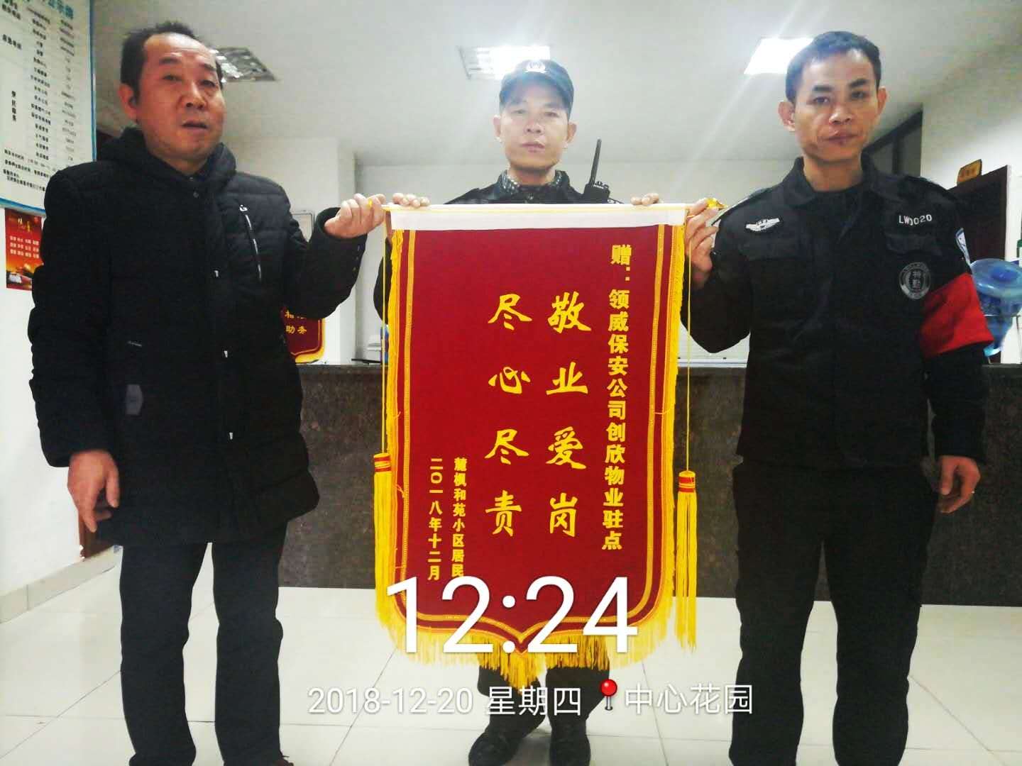 12月20日,小區(qū)業(yè)主為表示對(duì)我司保安員的感謝,特贈(zèng)送一面錦旗。