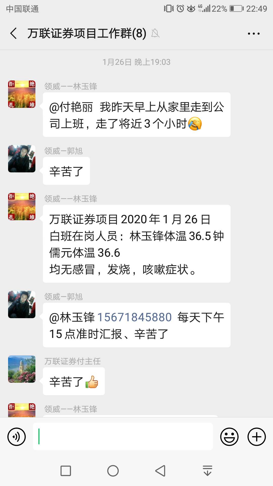 公司萬聯(lián)證券駐點林玉鋒,鐘儒元同志,疫情當前,道路封閉管控,義無反顧步行3小時到崗上班,他們不怕苦、不退縮,不畏艱難的工作作風更加堅定了公司全體隊員打贏這場疫情防控戰(zhàn)的信心!