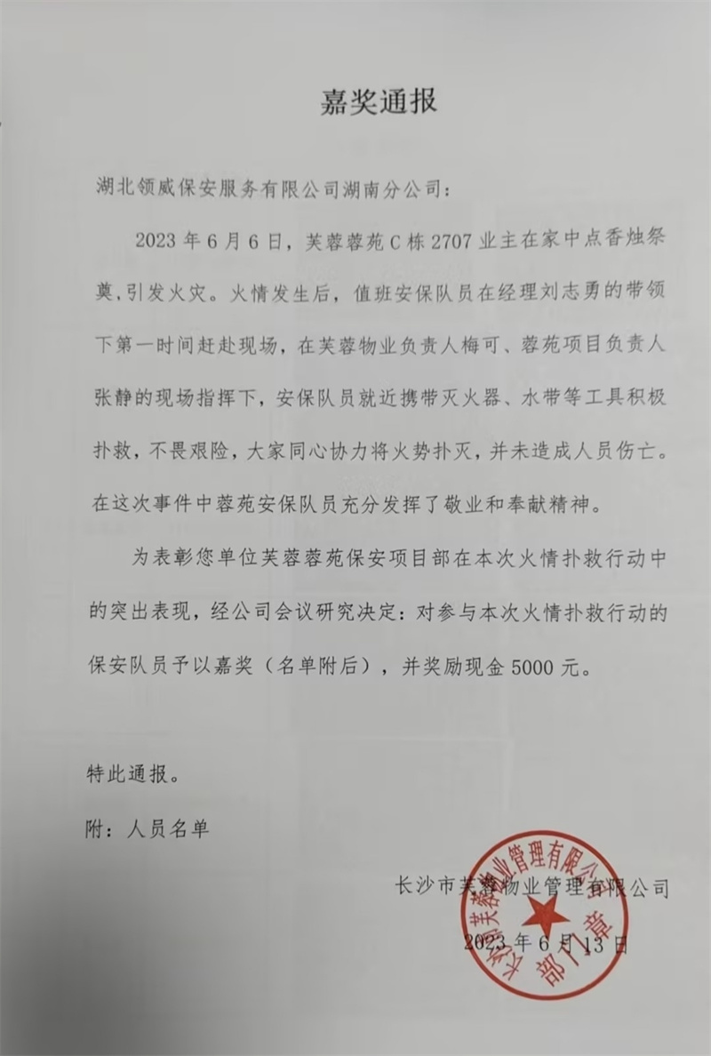 客戶單位長沙市芙蓉物業(yè)公司對(duì)此次事件中參與救火的安保隊(duì)員們的敬業(yè)奉獻(xiàn)精神給予了高度的評(píng)價(jià)及贊賞,并發(fā)布表揚(yáng)通告獎(jiǎng)勵(lì)現(xiàn)金5000元,以此來肯定隊(duì)員們的突出表現(xiàn)。