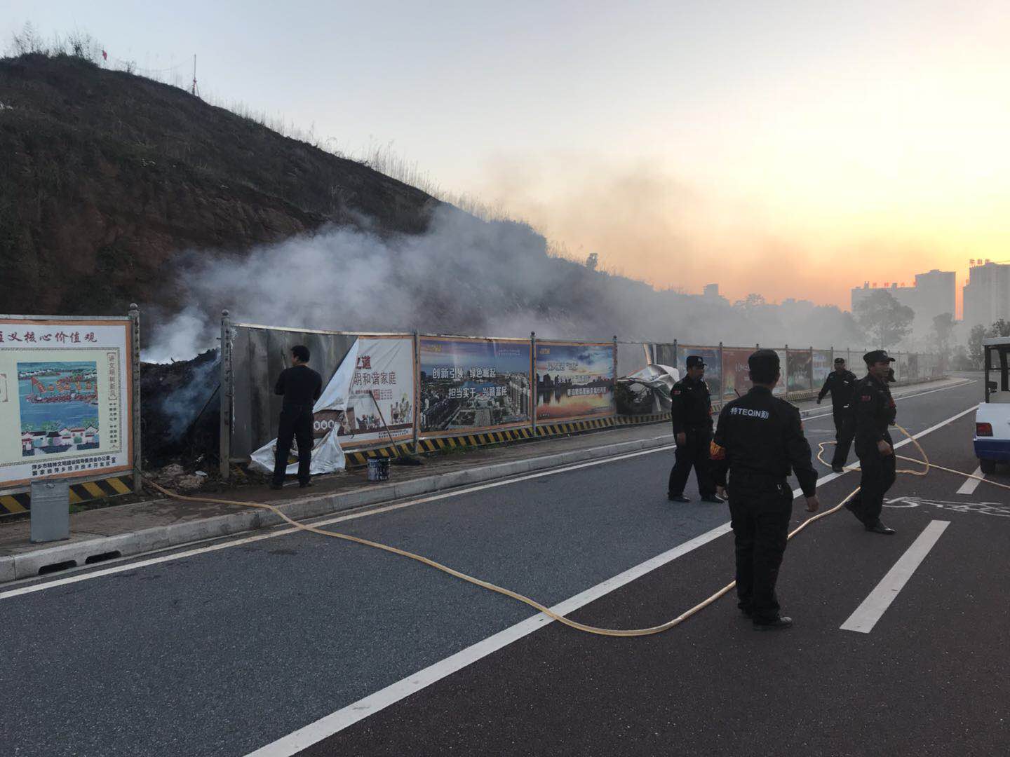 3月9日下午17:30分,萍鄉(xiāng)玉湖公園駐點南廣場值班保安員通報火情,南廣場與外部連接處山體發(fā)生明火,駐點保安經理向培重剛剛陪同江西省委領導視察玉湖公園項目后,正在對園區(qū)進行例常巡查,接到通報后立即通知臨近崗位值班人員快速支援,利用就近的消防栓迅速展開滅火行動,在全體值班保安員共同努力下, 2小時后徹底將火情消除。為防止暗火復燃,現場留下了兩名值班保安員關注到夜間23:00才撤回,客戶單位對我司參與滅火的所有人員進行了嘉獎,并對我司日常培訓后的效果及快速反應能力表示贊賞。