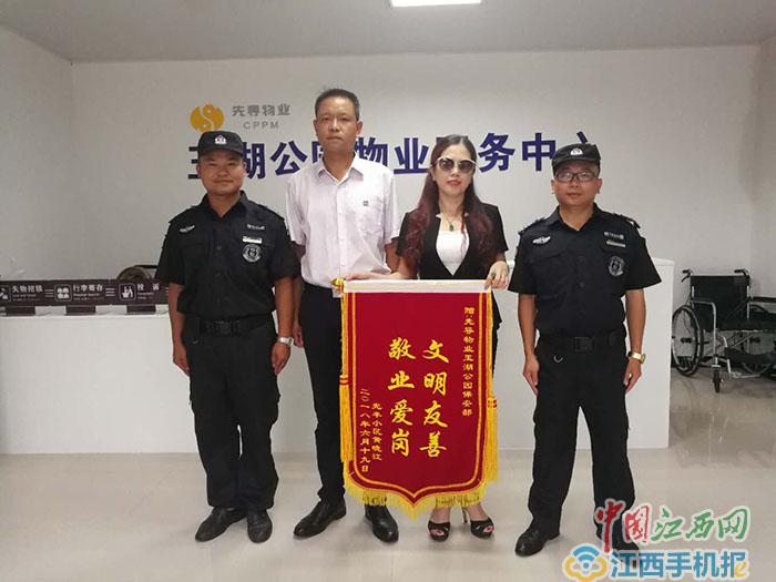 6月22日下午,湖北領(lǐng)威保安服務(wù)有限公司萍鄉(xiāng)玉湖公園服務(wù)中心響起了一串鞭炮聲,家住萍鄉(xiāng)經(jīng)濟開發(fā)區(qū)光豐小區(qū)的黃女士,將一面寫著“文明友善,敬業(yè)愛崗”的錦旗,贈給了熱心幫她找尋小孩的兩位保安,表達自己一片感謝之情。